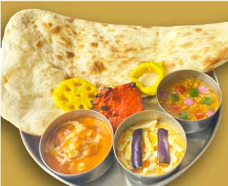 \1,500 Thali Set タンドリーチキン、野菜の天ぷら、3種類のカレーとプレーンナンのセット |